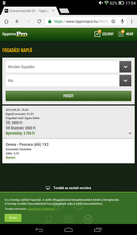 na gyerekek . észrevettem hogy van egy 50%-os bónuszom beten. aktiváltam. 20k volt a befizetésem, így 10k bónuszt kaptam. viszont meg kell játszanom 20k-t, hogy tudjam használni a 10k-t fogadásra. csak annyi a bibi, hogy maradt 1k a számlámon. azt kéne 20szor megforgatni, hogy használhassam a bónuszpénzt is fogadásra. mert ugye azt is meg kell forgatni. összesen 90k-t kell megforgatni. hogy ki lehessen venni a bónuszt. drukkoljatok