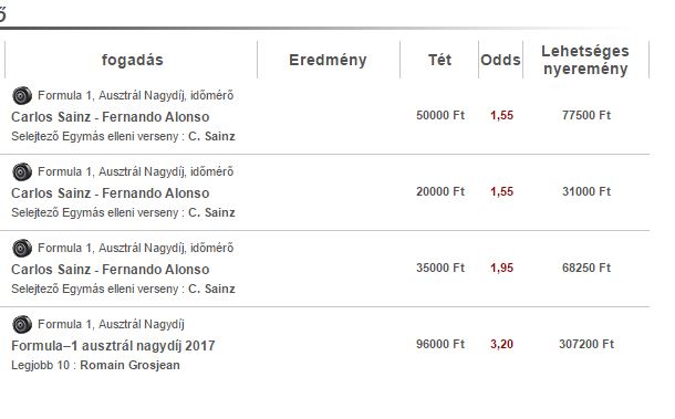 2.85 Romain Grosjean (FRA/Haas)Azt hiszem ez lesz a kiválasztott fogadásom nagy téttel. Feltéve hogy nem csökken nagyon a szorzója...