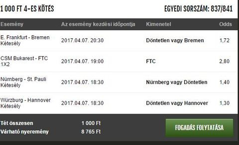 Bremen oddsa már 4, nem tudom miért, csupa olyan játékos hiányzik, akik az elmúlt meccseken nem játszottak.