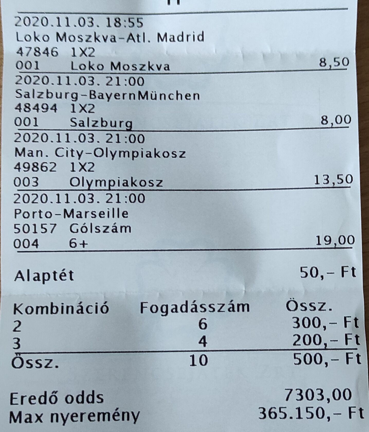 ,remélem volt olyan aki megrakta nagyobb összeggel,talán még hendivel is.Esetleg a 3-as kötés tiltás miatt hozzácsapott két 0,5 overes majdnem tuti meccset,és akkor kaszálás,