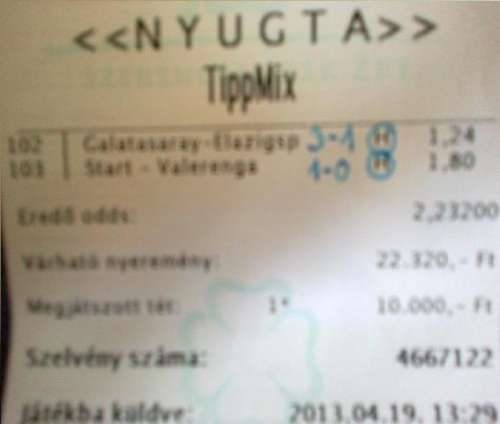 Az igazság az,h alig kezdtem még el a tippmixezést,de már rögtön mínuszba is vagyok.Hozzátok képest,vagyis sokszor amilyen tétekkel játszotok nem sokban,-3500 Forintban vagyok,de hát nem ilyenre számítottam...osztálytársam segít szívesen,de sajna az ő tippjei is 100%-osak,így miattuk is többször veszítettem,persze nyertem is,de így is még negatívban vagyok.