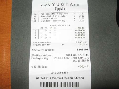 hát ez a mostani 500 forinttal menne ,és ténylegg nem vagyok egy mágus ,de néha vannak jó megérzéseim de általában mindig ilyenkor nem jutok el a lottozóba ,s hát azért ami legtöbbször előfordul hogy a papírformának tűnő meccs nem jön be így szoktak el menni a mixeim .de hát mindenkivel előfordul ,most hétvégén is a Schalkén meg az Atalantán ment el.