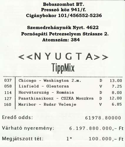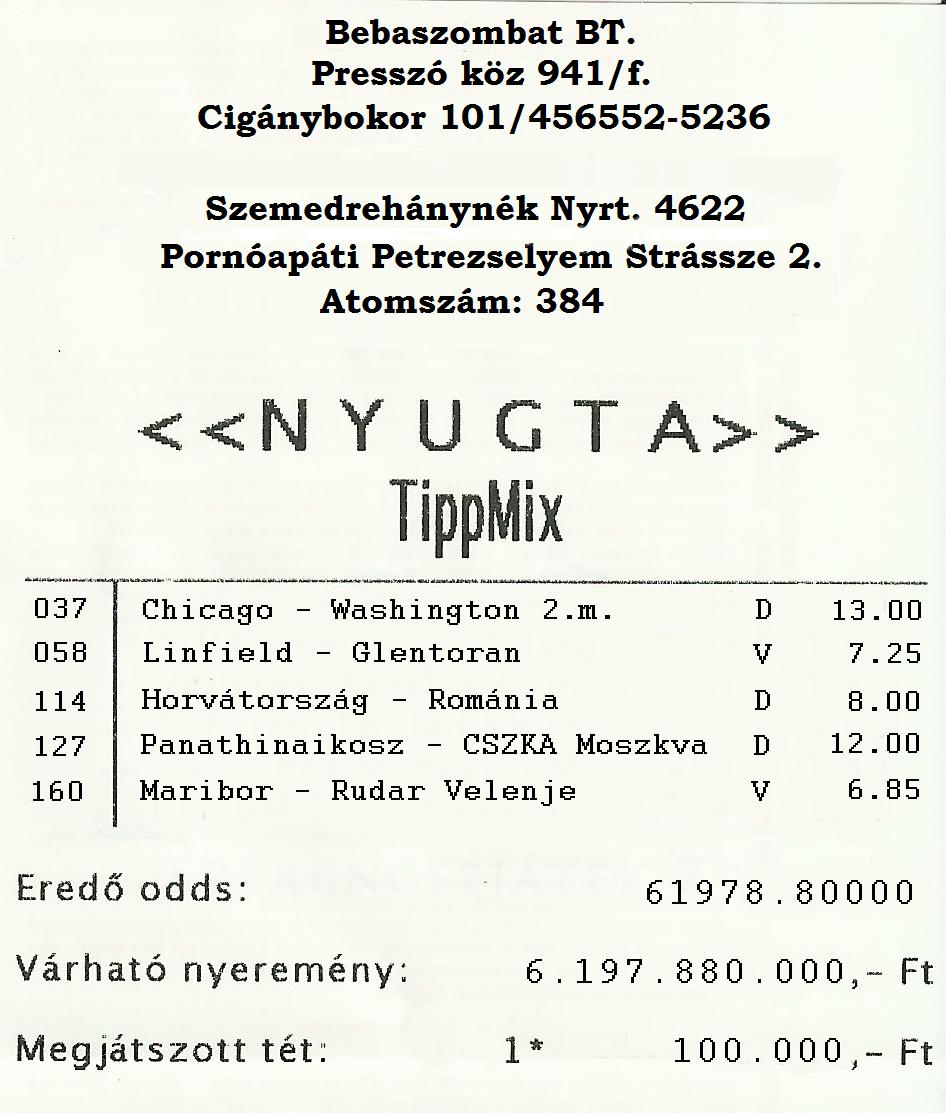 Nálam nem a kép volt a lényeg mert lesz@rom (meg amúgy is ezt szóval nem említettem mutass képet). A lényeg az mikor már jól állnak a meccseid akkor nyögöd be miket raktál, és hogy 20 ezerrel...Utána meg vagánykodsz hogy jaj csak sz@ros 20 ezerrel raktam de kár. Miközben ha nem álltak volna jól a meccsek azt a 20 ezret se mondod.