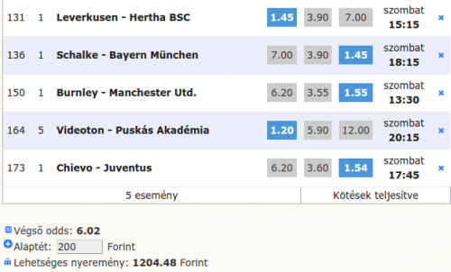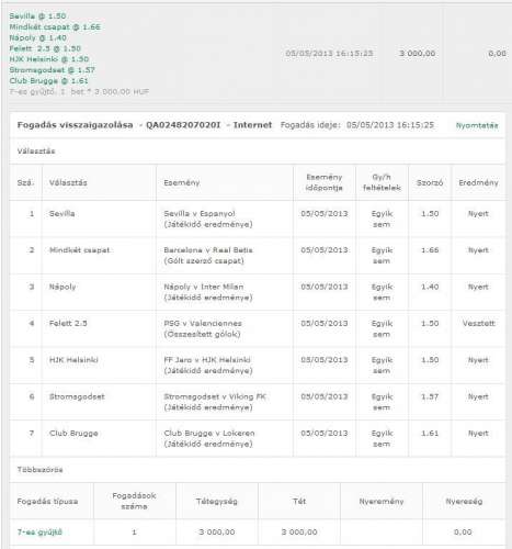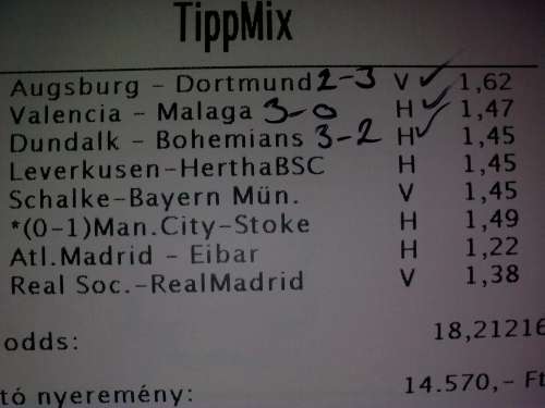 Nem, az a kami szelvényre szólt. Végül nem 5/7 kombit tettem, mert az már erős pénzkidobás lett volna. Egy meccset le kellett szednem, így csak ~1251x odds lett rajta 200 ->250.355 a nyerő szelvényen.