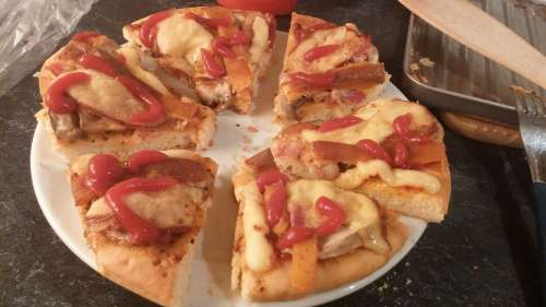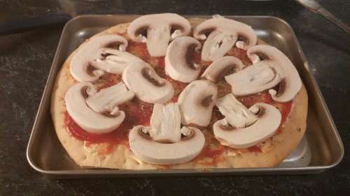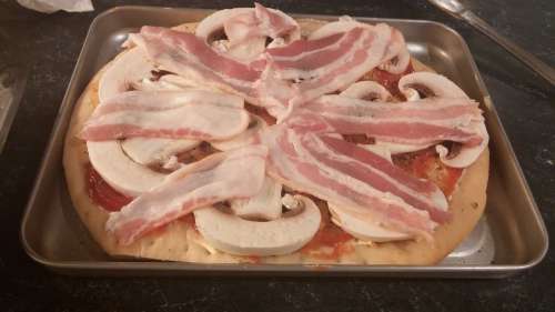 alaptészta, bords eve, ketchup, oregano, bazsalikom, (ugye szárított, ha más nincs), bors, só, szeletelt csiperke gomba, szeletelt bacon.