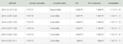 Fogadás típusa Fogadások száma Tétegység Tét Nyeremény Nyereség