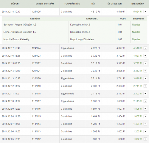 amikor underekre fogadtam élőben, akkor volt olyan hogy elkezdtem reggel 1500-el és estére 20k volt, de másnap meg elbuktam az egészet. ez úgy nézett ki hogy élőben félidő környékén tettem meg több meccset kötésben, hogy mondjuk volt 2 gól félidőig, és azt fogadtam hogy 5,5 under ilyen 1,05-1,1-ig voltak az oddsok. rengeteg ilyen is elment. volt hogy 5ből 1 mindig elment. amikor meg ezt próbáltam hogy overt teszek 10-15-ös oddsért hogy 2 gol van es 5,5 over kell akkor meg 20ból semmi nem jött...