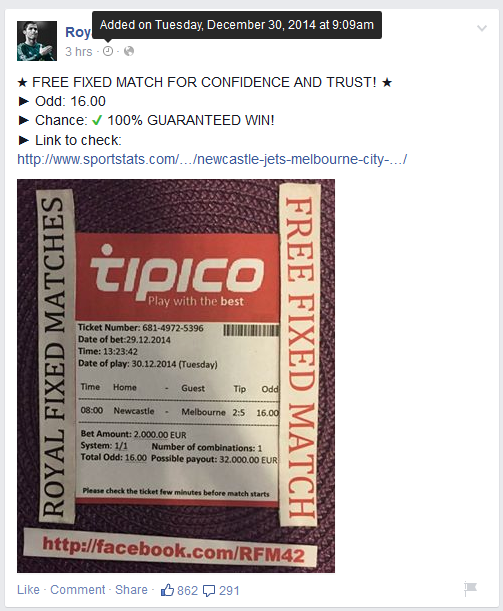 Nézegettem a facebookon a "Fixed Matches" oldalakat....ez a sok bal...z tényleg elhiszi, hogy valódi eredményeket kap????