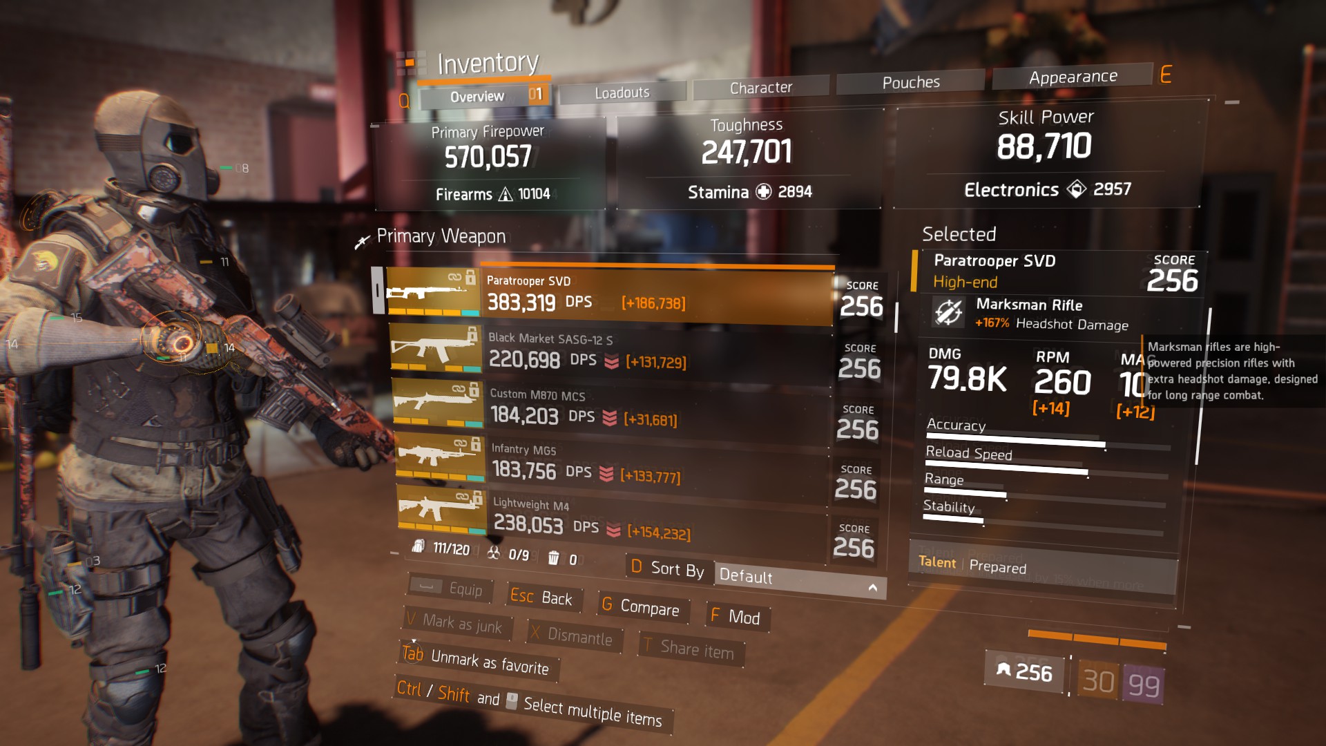 Most azt csináltam, hogy legyártottam egy halom 4-5-6 szintű itemet, elektronikára pörgettem, és így regisztráltam a fegyvereket, hogy a 4 különböző karakternél és a stashben lévő fegyverek könnyen összehasonlíthatóak legyenek, kemény 535 TF értéknél, és így biztosan nincs semmi módosító, ami hatna az alap sebzésre