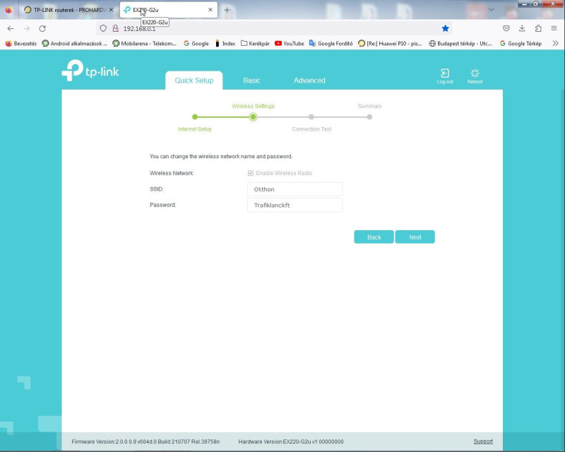 Band Steering – Az EX220-G2u automatikusan hozzárendeli eszközeit a legjobb elérhető sávhoz a Wi-Fi környezetnek megfelelően, kiegyensúlyozva a hálózati terhelést, hogy minden eszköznek optimális kapcsolatot biztosítson.Ez általában választható egy kétsávos routernél, de úgy tűnik ennél fixre vették. Egy dolgot még megpóbálhatsz, mielőtt megválasz tőle. A quick setup-ot csináld végig az elejétől, és ha elérsz a vezetéknélküli beállításhoz, ott pipáld be a Set Each Band Separately részt (persze csak ha van ilyen a menüben) és ott adhatsz külön nevet a wifi sávoknak.