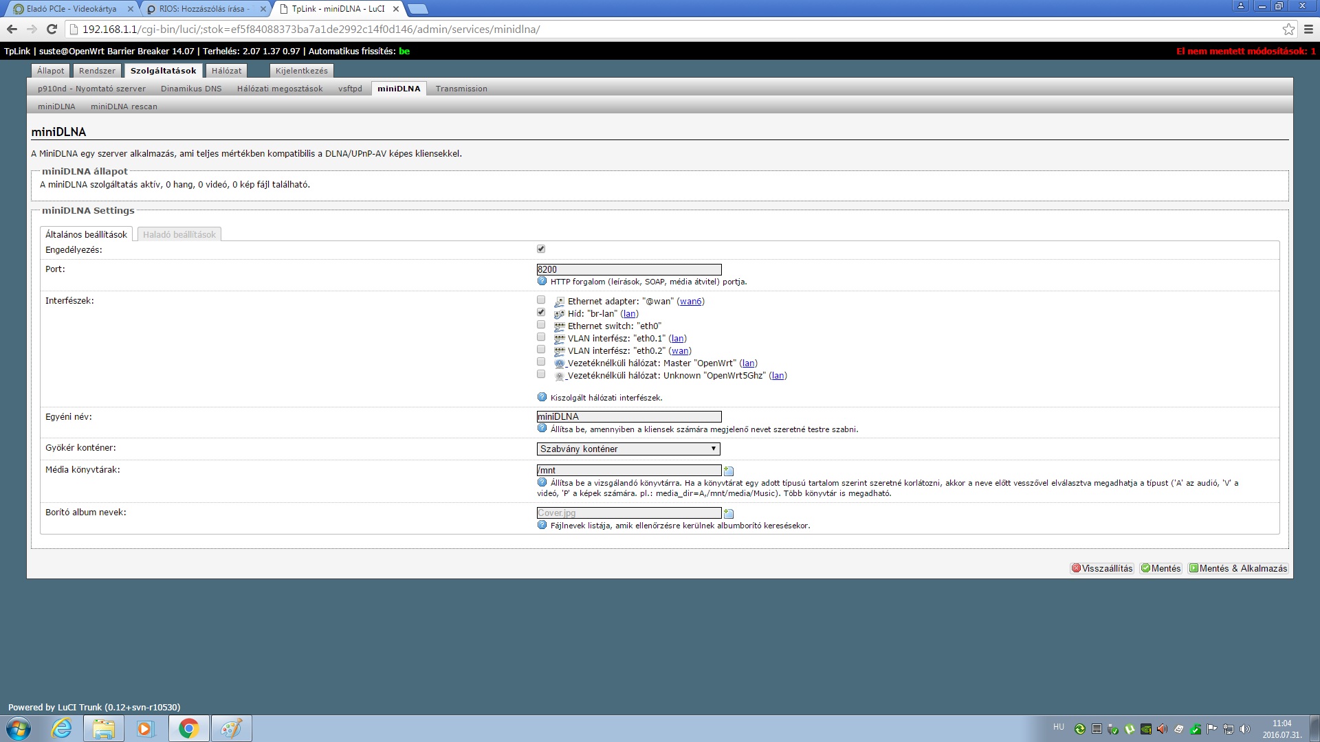 A miniDLNA szolgáltatás aktív, 0 hang, 0 videó, 0 kép fájl található. -