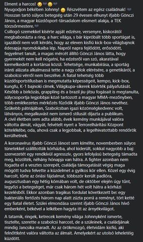 z engem eléggé sokkolt. Nem csak azért, mert helybeli; fiatalon, élsportoló TEK-es, fél tucatnyi küzdősportban jeleskedett, többen komoly sikereket ért el, brutális fizikum, s ekkor jön a leukémia... az orvosok alig adtak neki pár hónapot (a koronavírussal 'karöltve'), de igazi harcosként úgy nézett ki, hogy ezt is leküzdi.