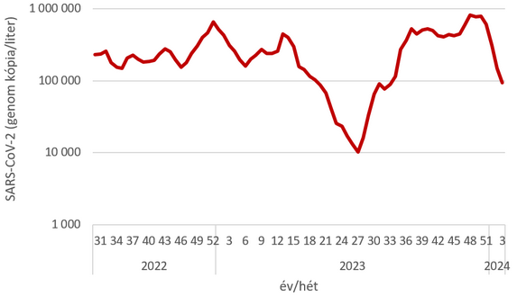 "2024. 2. hetében a szennyvíz SARS-CoV-2 örökítőanyag koncentrációja országos átlagban csökkenő tendenciát mutat. A mintavételi helyek többségénél csökkenés mérhető, stagnáló értékek Eger, Kecskemét, Pécs és Szekszárd esetében jelentkeztek. Emelkedés egyik vizsgált településen sem detektálható."