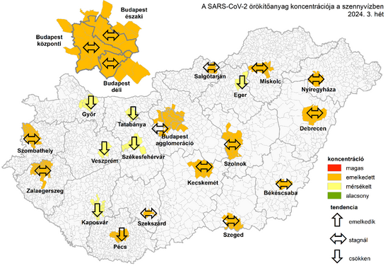 "2024. 3. hetében a szennyvizek SARS-CoV-2 örökítőanyag országos átlagkoncentrációja csökkenést mutat, bár a csökkenés mértéke az előző héten tapasztalt változáshoz képest kisebb mértékű. A vizsgált települések többségét tendencia szempontjából stagnálás jellemzi; csökkenés mérhető Egerben, Győrben, Kaposváron, Pécsett, Székesfehérváron, Tatabányán és Veszprémben. Emelkedő tendencia sehol sem jellemző."