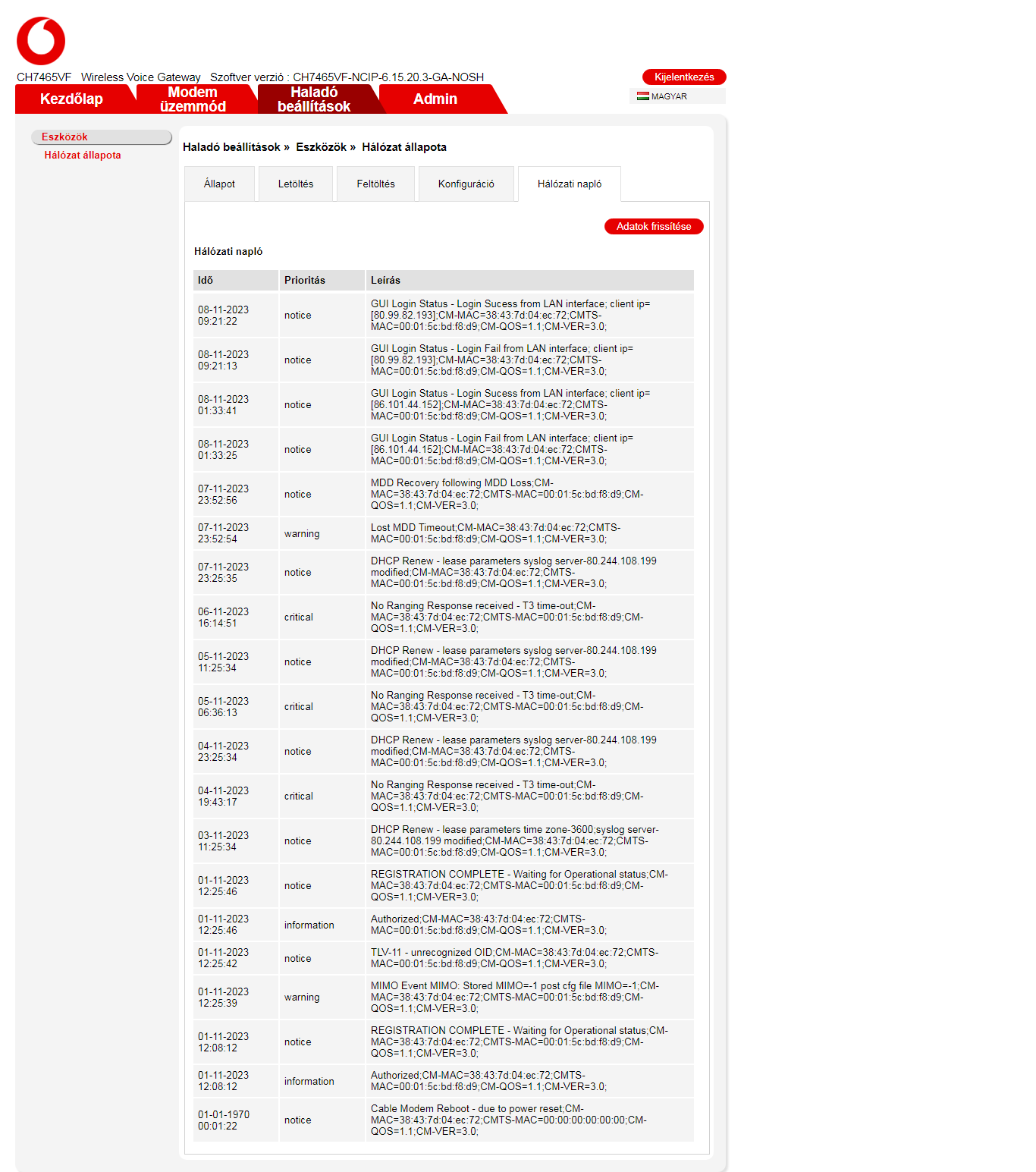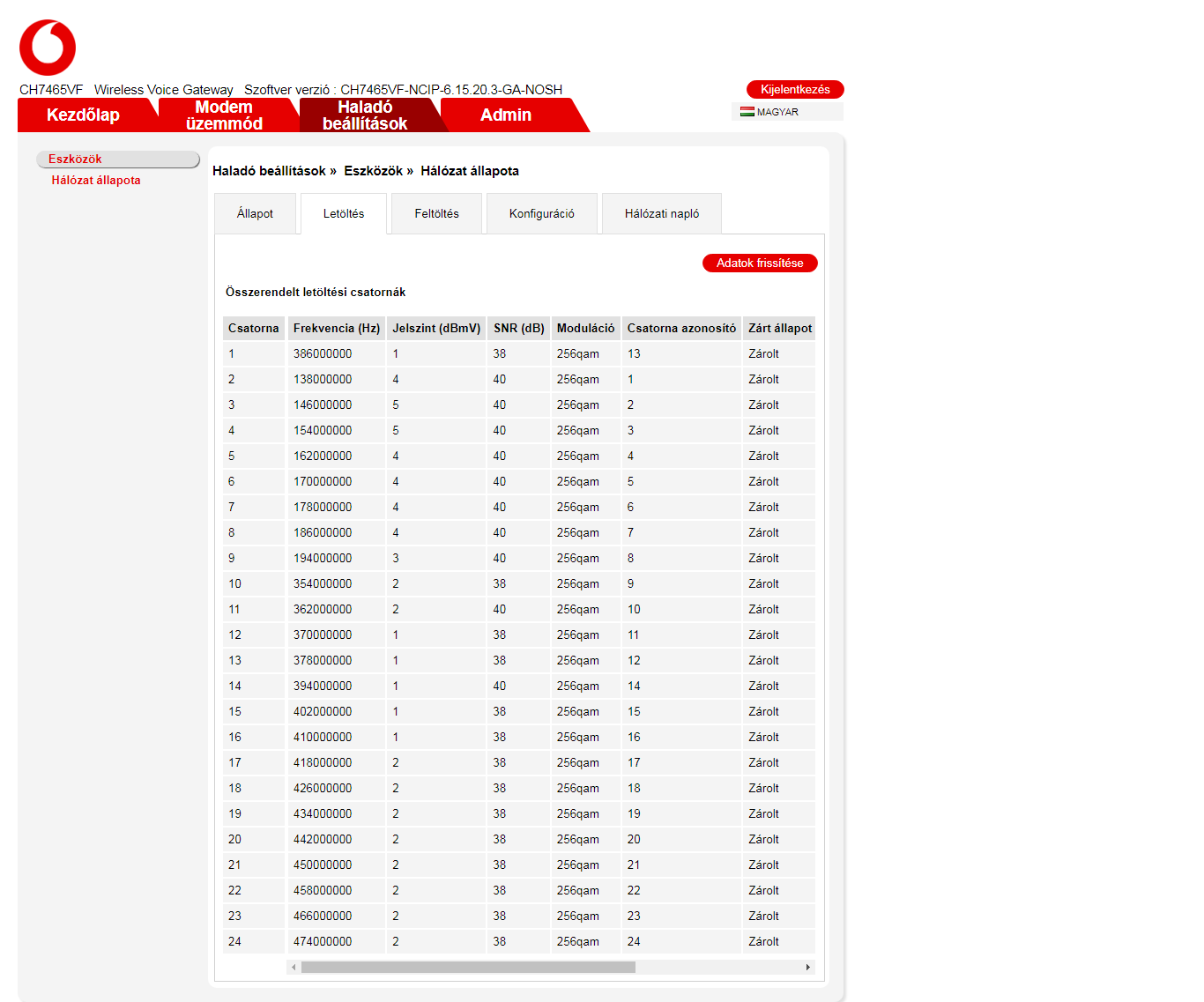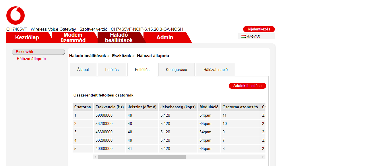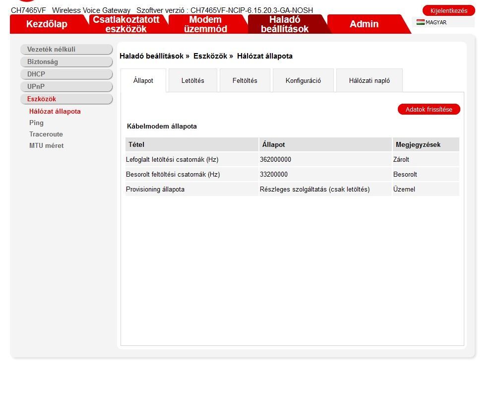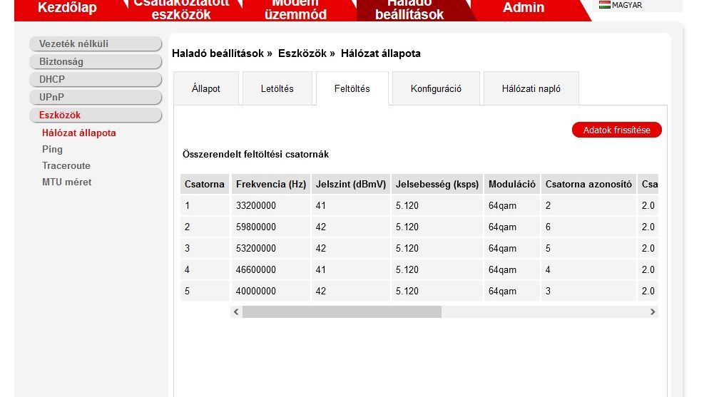 Modem értékek és a bejövő jelerősség rendben van, magasabb letöltési csatornáknál több a hibás csomag, de ettől még lehetne stabilabb az internetkapcsolat.