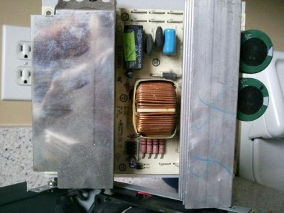 A képen a primer oldal panelje (kétpaneles a táp, ennek a végén van 300valahány volt egyenfesz a két pufferen, ez megy a második panelbe egy csatlakozóval), az ezen található relé kattog (fekete, zöld matricával). Normálisan csak ki és bekapcsoláskor kattan. Most a terheléssel arányosan nő a kattogás frekvenciája...