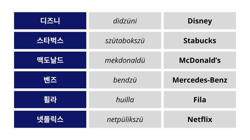 net-pül-lik-szüA McDonald'sra mernék tippelni, a többinél az ü-k elhagyása után Disney, Starbucks, Benz, Neflix a legvalószínűbb. Az ötödik passz, valami koreailag nagyon kiejthetetlen név lehet ennyire torzulva.