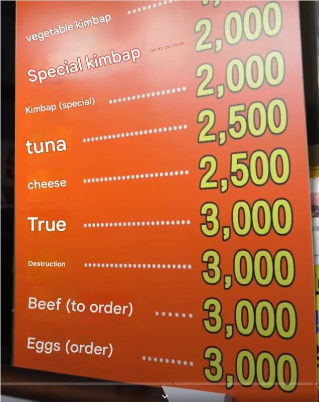 Itt pl. a「참땡」(alulról a 4.) szóval azért nem tudott kezdeni semmit, mert nem tudja, hogy azt valójában a 참치 (konzerv tonhal) és a 땡초 (helyi erőspaprika) „kezdőbetűi” alkotják. Ha valakinek pontos igényei vannak, hogy mit akar enni, akkor az itt nem fogja megúszni a dolgot pusztán fordítással, akinek meg mindegy, annak fordítás se kell, csak rábök valamelyikre.