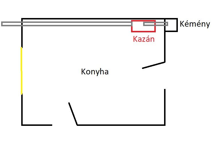 A rajzot más miatt csináltam de látszik rajta , hogy a konyhai fal , amin a kazán van , az a kis szobával közös fal.