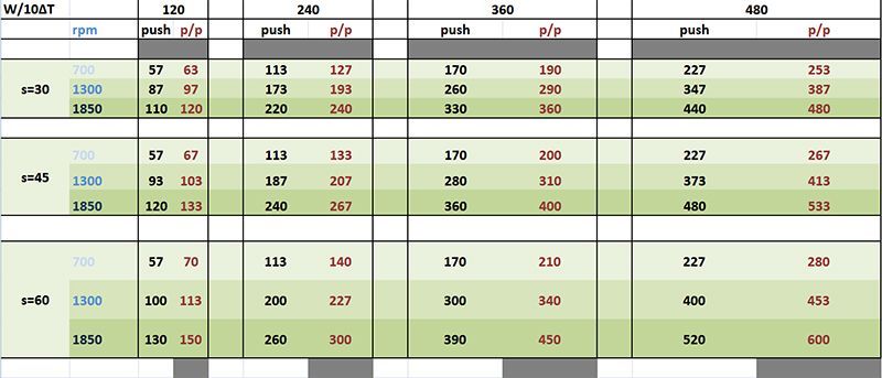 Ez alapján ha veszek egy worst case scenario-t, és nyáron mondjuk 30 fok lesz a nappaliban, akkor 10 fok vízhőfok emelkedéséhez 45 mm magas 360-as radiátorhoz, egy oldalról fújt ventivel 1850-es fordulat kell.