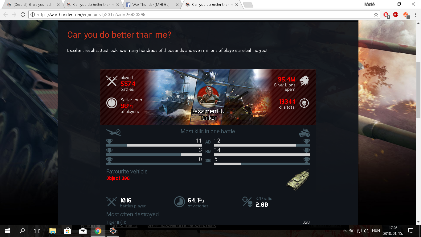Szeretem az ilyen epic meccseket, sajnos nagyon ritka, de ezért szeretek még mindig játszani. Amikor jól elhúzódik egy meccs, megy az adok-kapok kill is van, élmény is van.Tavaly volt egy hasonló meccsem németekkel eastern Europe-on, legyaktak minket elég hamar, de sikerült megfordítani a meccset a végére. Tigrissel kezdtem, volt tán 1 killem max 2. aztán kilőttek, bementem Jagdpantherrel, de ezek már a házak közül, dombról, mindenhonnan lőttek, csak mögülünk nem (akkor már élt a spawnvédelmi zóna). Elkezdtem tolatni (igen azzal a kemény 2-3 km/h-val), és forgattam a Jagdot ahogy bírtam, lett rajtam vagy 12-15 lepattanó, kilőttem 4-et, keményebb dögöket is, aztán mentem foglalni középre (1 cap volt a mapon), meg is nyertük.