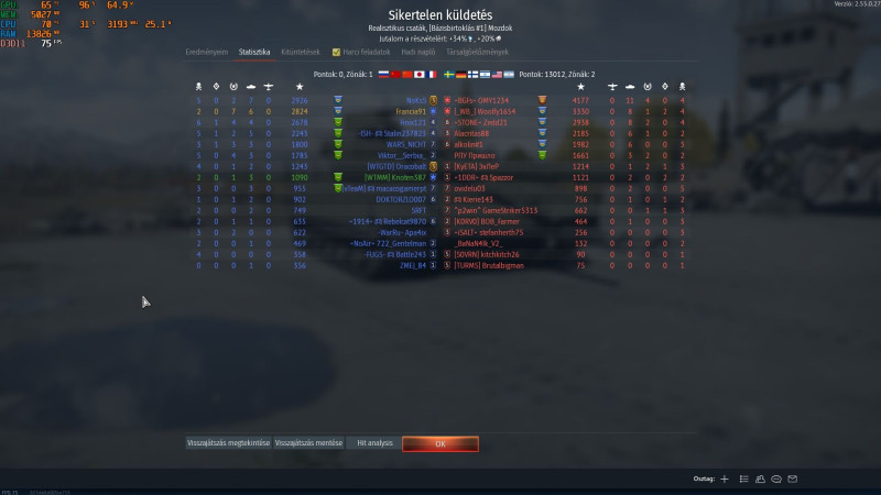 Ellenben az új frissítés hozott egy újabb gondot : nevezetesen mostmár nem működik a Riva Tuneres hőmérséklet, órajel, és memória foglalás kijelző overlay, mert egyszerűen csak nincs ott ahol lenine kellene. Minden más játékban továbbra is működik, a WTben ugyan nem! Köszönjük ezt az újabb visszafejlesztést.A "játékélmény" :