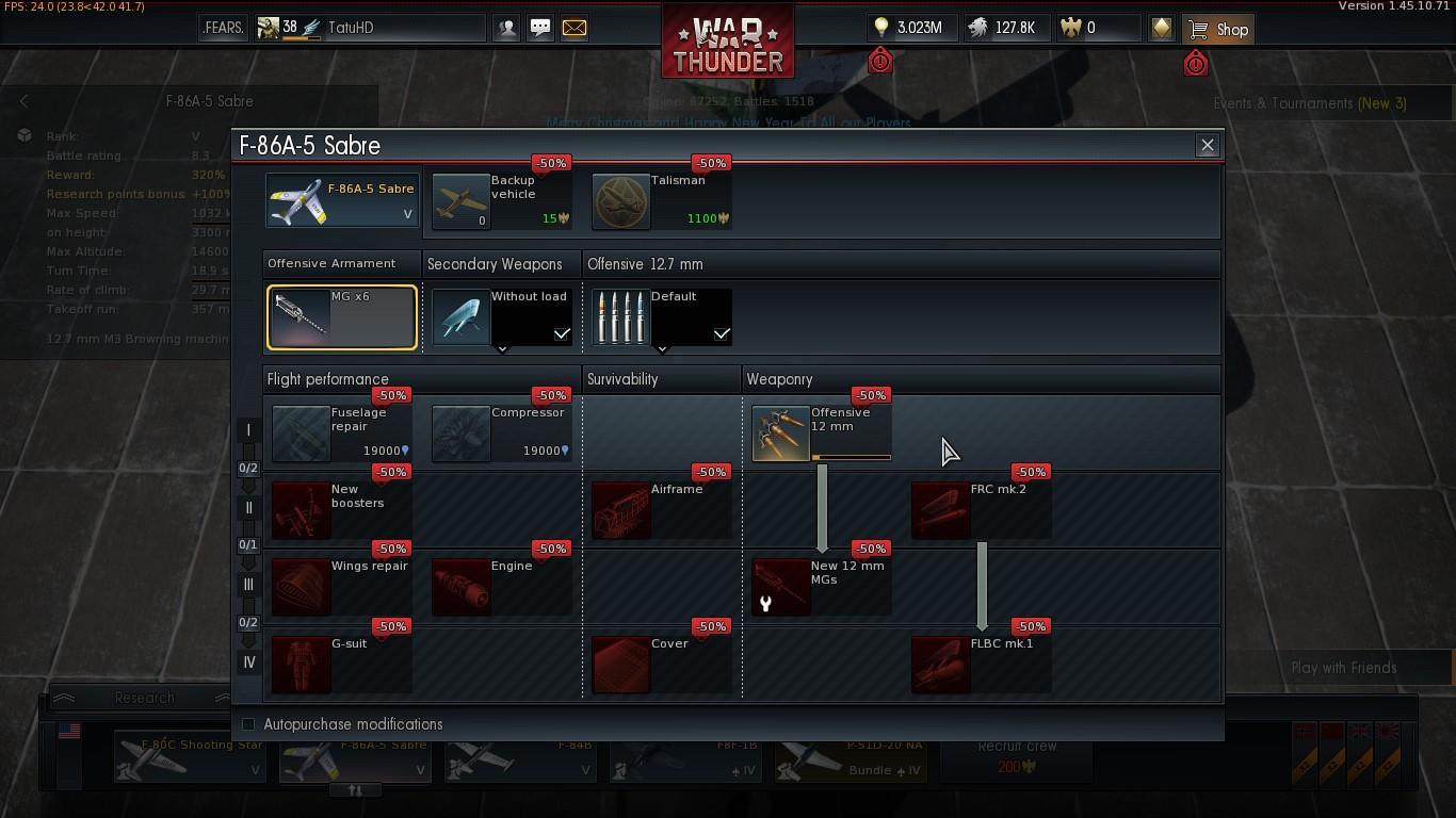 Én az M2-esben és az M3-asban is Ground Targets befűzést használok kivétel nélkül mindig. Szépen kigyújtja az ellenfelet, meg igény esetén Light Pillbox-okat is lehet vele fűnyírózni. Nekem nem volt problémám a Default befűzéssel sem (bár az előbb említett jobbnak tűnik), én még csak az F-84-ig jutottam el (amit nem is használok, mert rövidebb kifutókon lehetetlen vele felszállni....), az F-80C-vel rendszeresen repülök, de pl a Mig-9-eseket viszonylag könnyedén le lehet szedni az M3-assal, nem kell belepumpálni a fél tárat, az IL-28 is kevés lövéstől kigyullad és szétég, ha a szárnyát lövöd felülről, ez szinte mindig beválik. Tudni kell, hogy hova lőjj, kitapasztalni. A szárnyak pl elég sérülékenyek, főleg az üzemanyagartály miatt, meg a motorok is gyengepontok