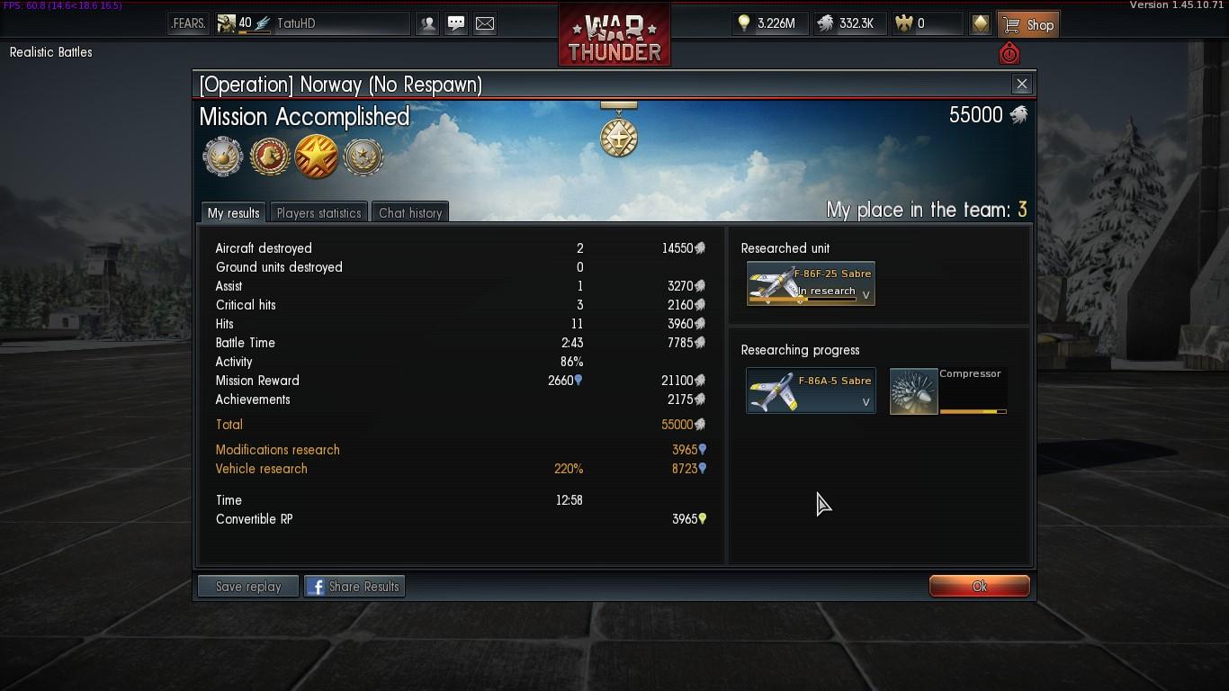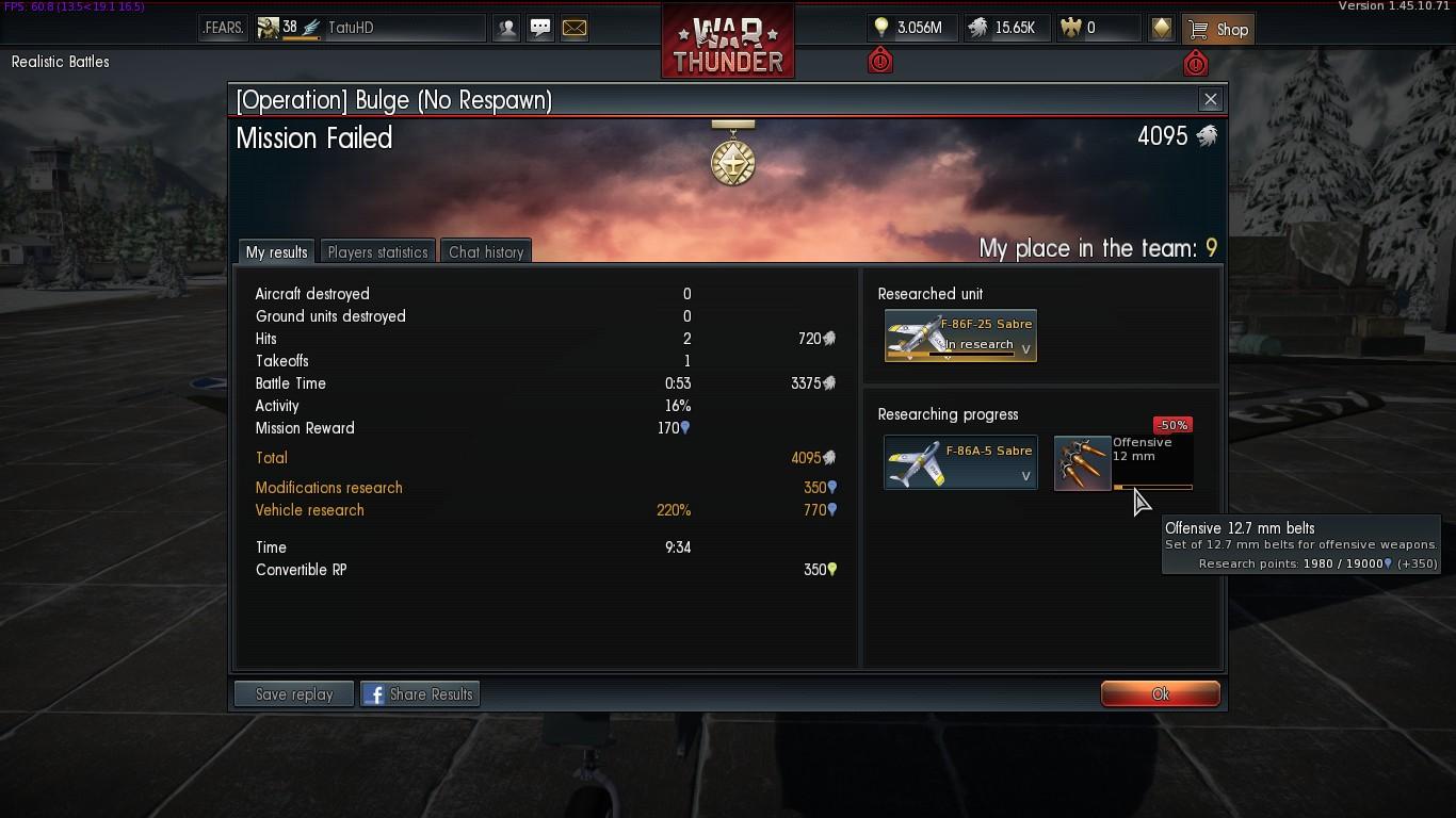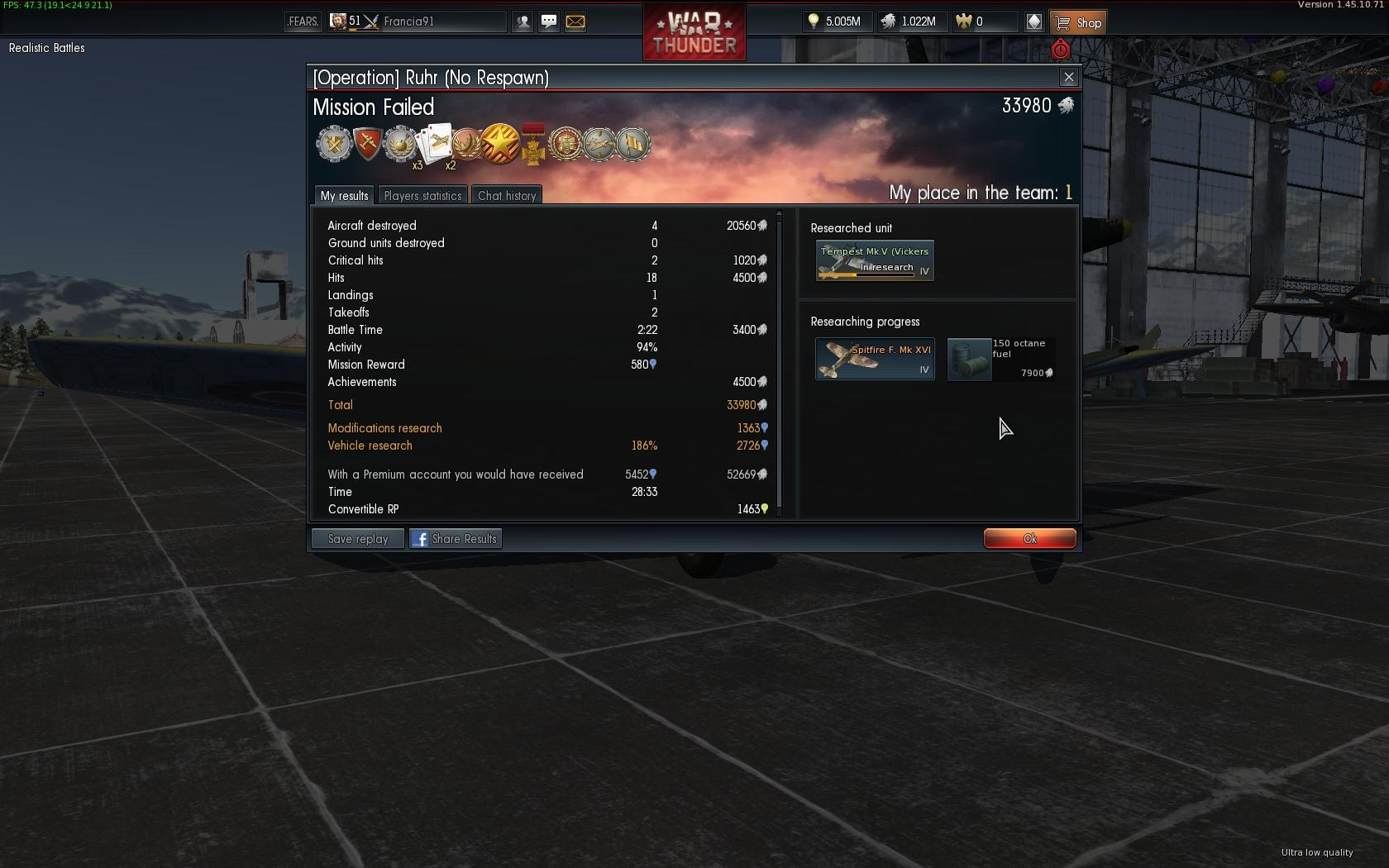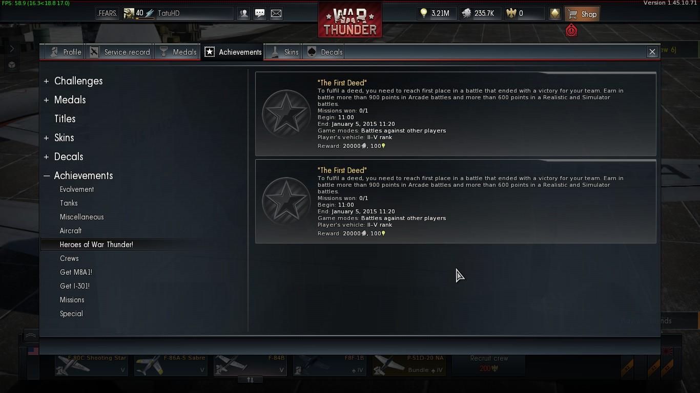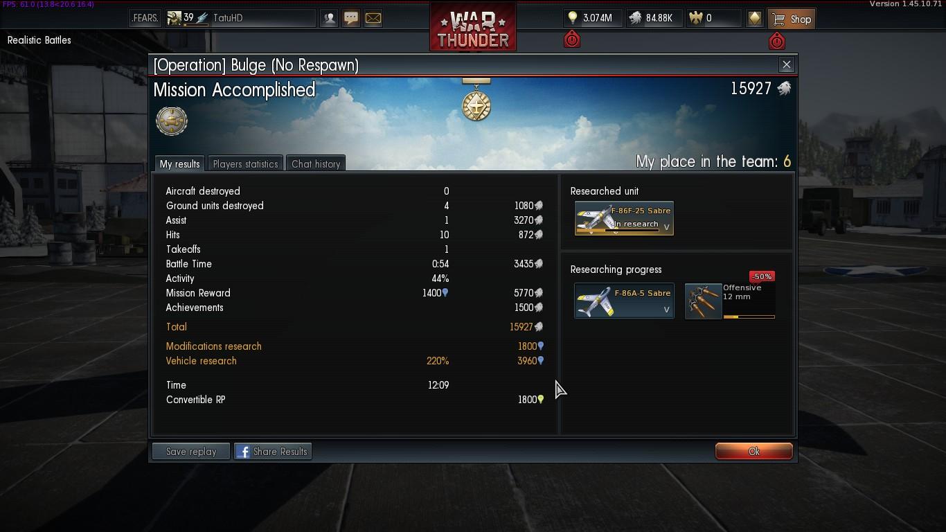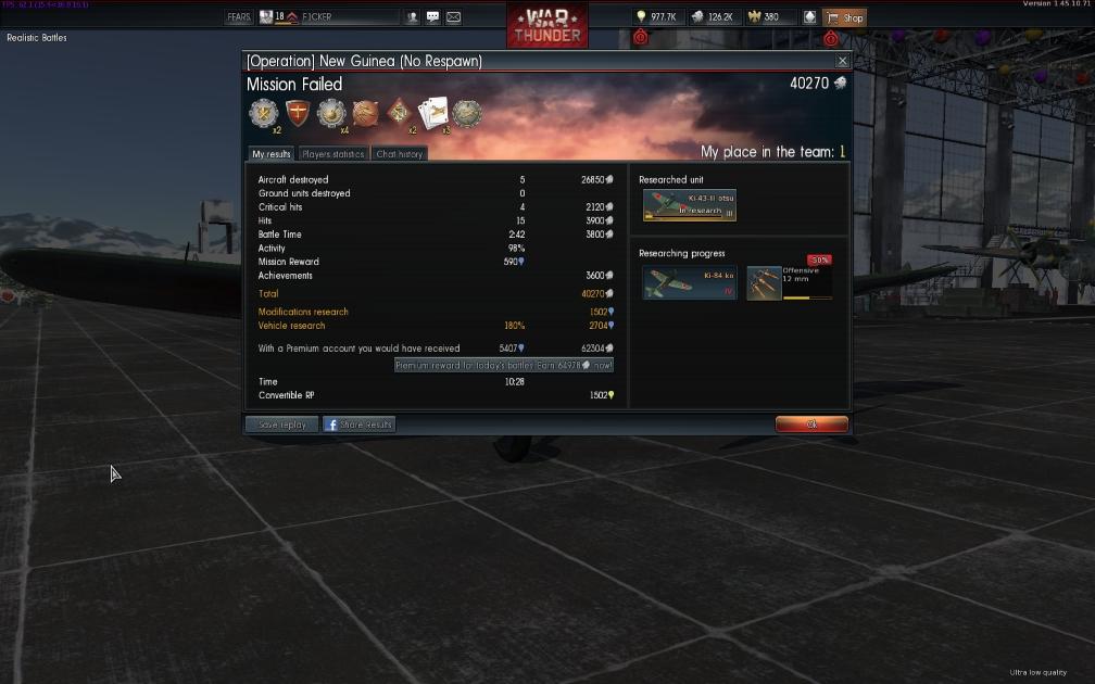 Haggyad má, én is most szenvedek vele, végre lett egy nyertes AB-nk, ahol én voltam az első, erre nézem, hogy nem kaptam meg. Persze, mert nem figyeltem először hogy rank II-V repülő kell hozzá, én meg szaros Ki-10-es meg Ki-27-ekkel vágtam neki. Nem az a baj nálad is?