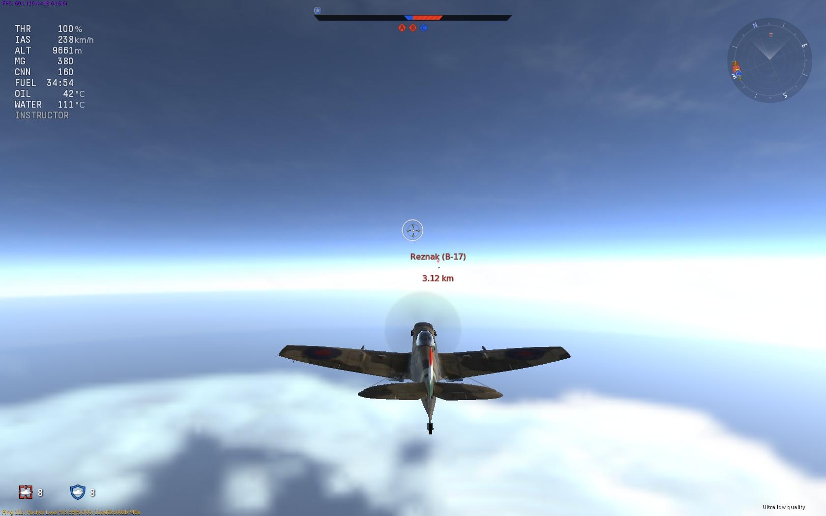 Én most egyedül a Spitfire Mk XVI-vel tudok értékelhető meccseket menni. Picit kevés a lőszer, az IL-10-et lőhetem a végtelenségig, ezt leszámítva remek kis gépnek érzem. Gyönyörűen mászik, pedig még van rá fejlesztésem, jól fordul, és 10G-t is kibír, amit az előző Spitekről nem lehet elmondani, 6-7 G-nél repültek a szárnyak