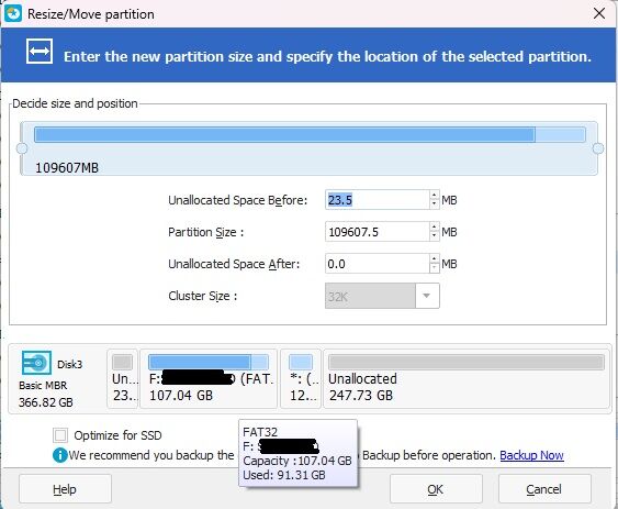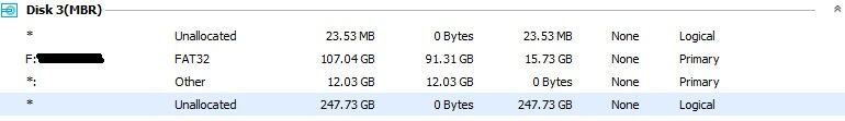 400GB-os SD kártyát szeretnék particiónálni. Két allokálatlan terület van rajta (kép szerint), de bármi csinálok Easeus-ban, ha az F-et szeretném növelni, csak a kicsit (23,53MB) hajlandó hozzáadni, a 247,73GB-ot nem engedi hozzáadni az F-hez. Miért?