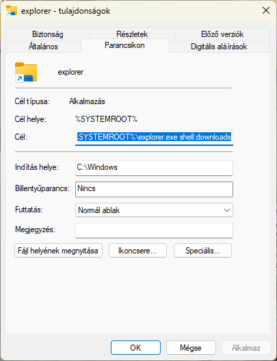 Rányitsz sajátgépre, beírod keresőbe "explorer.exe". Találni fog egy futtatható binárist c:\windows mappa alatt. Ott a találatok listában jobbklikket nyomsz rá, és klikk parancsikon létrehozása. A win figyelmeztetni fog, hogy oda a win könyvtárba nem tudja megcsinálni, de kirakhatja neked az asztalra, ha az megfelel - elfogadod. Lesz egy explorer.exe shortcut-od a desktopon. Jobb klikk rá, properties, "start in" mezőt törlöd, a "target" mezőben meg az explorer.exe után oda írod neki a "célkönyvtárat". Aztán apply + ok. Például én a trget mezőbe írtam egy ilyet: