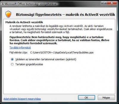 Esetleg nyisd meg a power point-ot és, nézd meg az adatvédelmi beállításoknál a makró és active-x beállításokat, és állítsd be, hogy kérdezzen rá! Utána próbáld meg megnyitni újra a dokumentumot, és ha kérdezni engedélyezd a futtatást! -