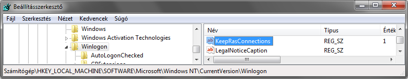 Na kikerestem és létrehoztam a karakterláncot "KeepRasConnections" Erteke 1