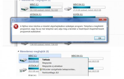 A következő problémába ütköztem. Például, ha a sajátgépben bal klikkel megszeretném nyitni valamelyik meghajtót, vagy mappát a kép felső felén látható hibaüzenet fogad. Valamiért a tallózást vette alapértelmezetté, nem pedig a megnyitást, ami a kép alsó felén látható.