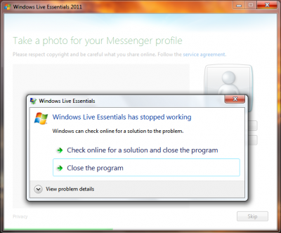Nemrég telepítettem friss windows 7-re a Live Essentials-t, de mikor elindítom a Messengert, előjön a "Take a Photo..." reklám, majd összeomlik, ezután ha bezárom akkor elindul a Messenger, de ezt minden indításnál eljátssza, mert mindig összeomlik az a nyavalyás reklám.