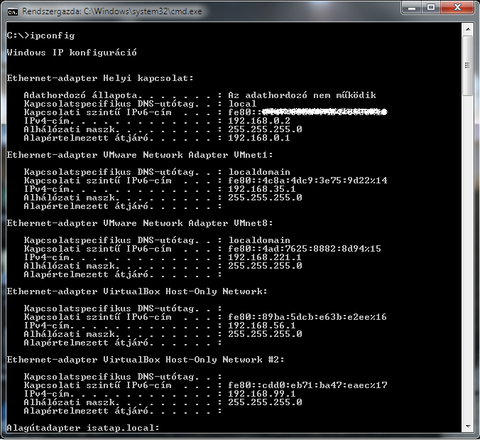 Szerk.: ja igen, a konzolos képen ipconfigra azt írja, hogy "Az adathordozó nem működik". (Itt adathordozó alatt aszem a hálókártyát érti, csak anno hülyén fordították le).