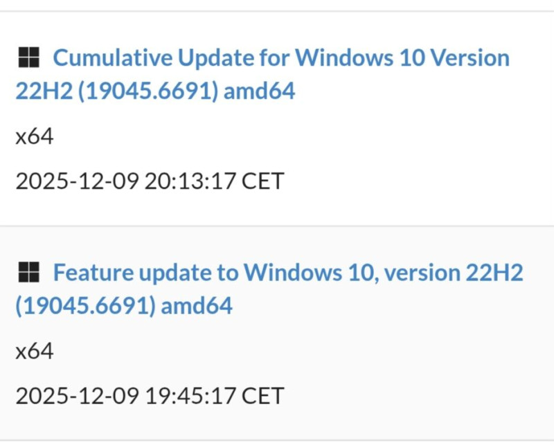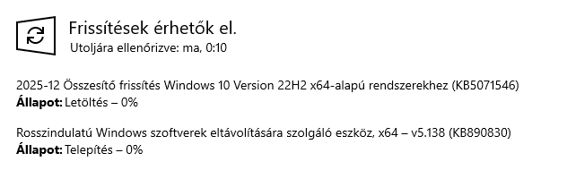 Ha a decemberi KB5071546 számúra célzol "legutolsó frissítéseket" alatt, akkor ahhoz meg értelemszerűen regisztrálni kellene a "Fogyasztói Kiterjesztett Biztonsági Frissítések (ESU)" programba, mivel a Windows 10 általános támogatása október 14-én megszűnt, ami nemrég már el lett magyarázva a #159674 számú hozzászólásban.A microsoftos MCT jelenleg a 19045.3803 buildszámú Windows 10 ISO-fájlt tölti le, ami nem e legújabb (19045.6691). De ez nem is feltétlen gond, mert telepítés után a Windows Update eleve naprakészre frissíti a rendszert. Bár abból a szempontból gond lehet, hogy ha a régi ISO kis méretű helyreállítási (WinRE) partíciót hoz létre, akkor amiatt nem települnek egyes frissítések és manuálisan kell megnövelni a méretét (bővebben).