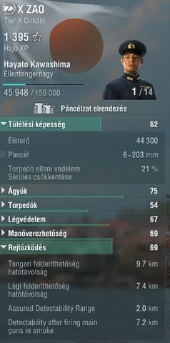 Hit points – 82300. Plating - 25 mm. Armor belt – 230 mm. Torpedo damage reduction – 34%.