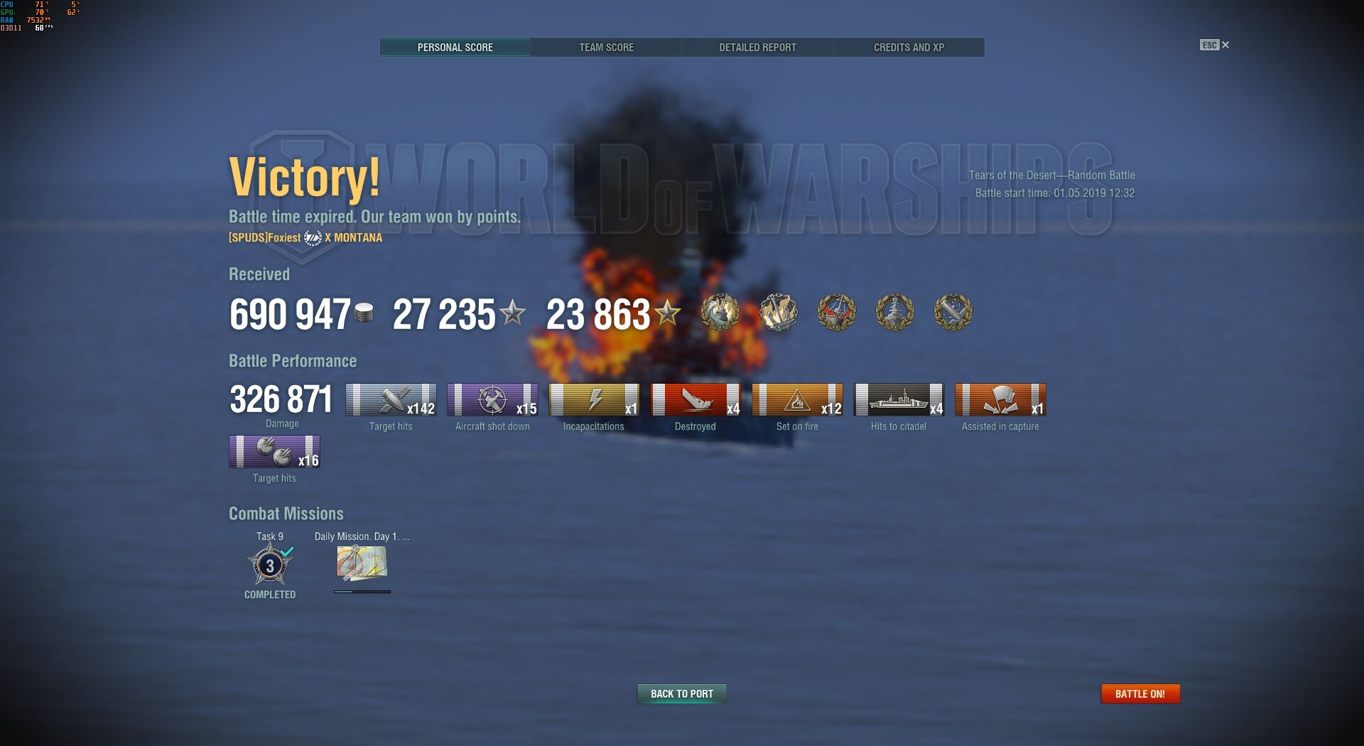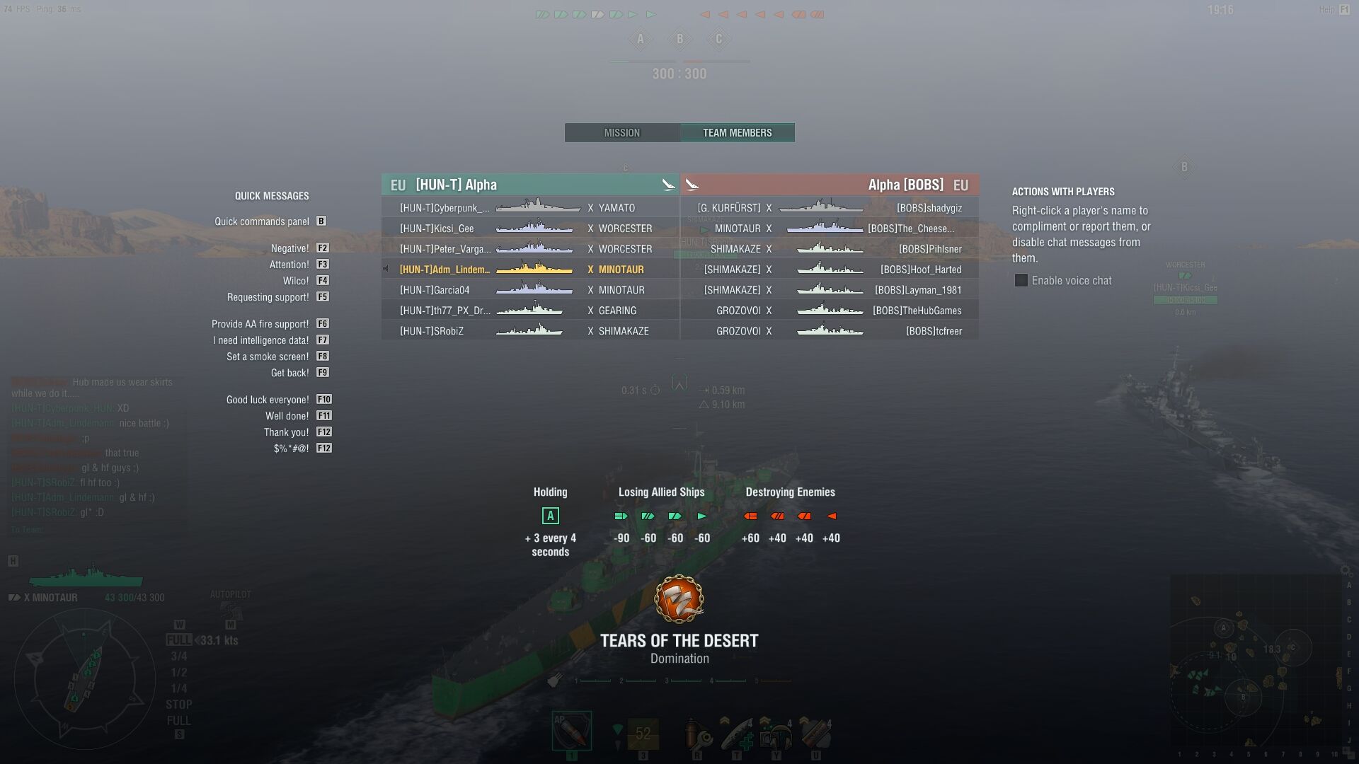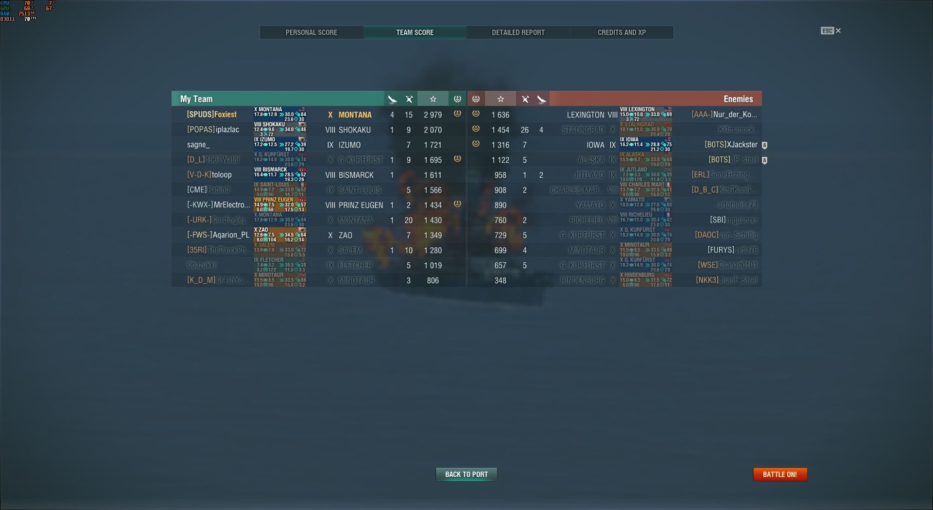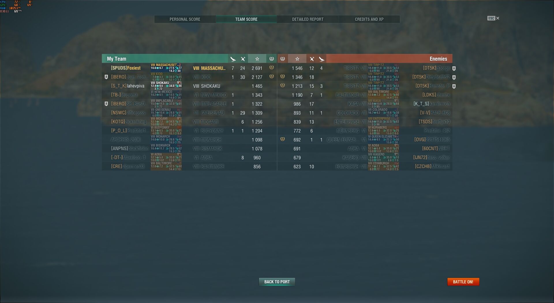 Üdv a klubban, nálam ez 2 napja tart. Ma 4 lose után tudtam a yamatomat kiszorzózni, majd a montimmal próbálkoztam, de feladtam 3 lose után. Majdnem 137k átlag dmg-el nem mondhatni, hogy nem csináltam semmit, de a csapat többi tagja, vagy suicide rusholt és megdöglött 5 perc alatt, vagy ment a lemming train. És egy meccsem se volt sima standard battle, mind capture pontos térkép volt, és minden vesztes meccsen az enemy foglalta be mindhárom pontot, míg a mi dd-ink elmentek bb-ket torpedózni a flankről, amíg a cv-k ki nem klikkelték őket. Én meg kb csak kullogtam hátul, mert pusholni nem lehetett spot nélkül, úgy hogy az enemy dd-k torpedóit kerülgettem.