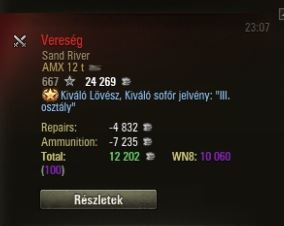 AMX 12t megosztó tank. Vannak akik imádják vannak akik utálják. Én az előbbiek táborába tartozom. Nagyon agresszívan nem szabad vele játszani, mert a gyorsulása nem az igazi, ezért aktív spotra sem ajánlott. Ez egy igazi sunyi tank, vársz megbújva egy sarkon aztán ha nem rád figyel az ellenfél bemész mögé/mellé és kitárazod aztán mész vissza fedezékbe. Elég sokszor volt hogy top sebző lettem vele 9-es csatákban is. A wn8-at meg beteg módon adja, 1 tárat még gyenge játékkal is bele lehet ereszteni az ellenbe és már azért is majdnem 2000 wn8-ad ha jól rémlik. Ha meg összejön vele egy jó kör ami nem ritka akkor 10e feletti wn8-at ad. Ha rerollt csinálnék és csak a sebzésre mennék rá akkor 5000 feletti wn8-at tartanám vele. De szerencsére engem nem érdekel annyira a stat, én azért játszom vele mert szórakoztató.
