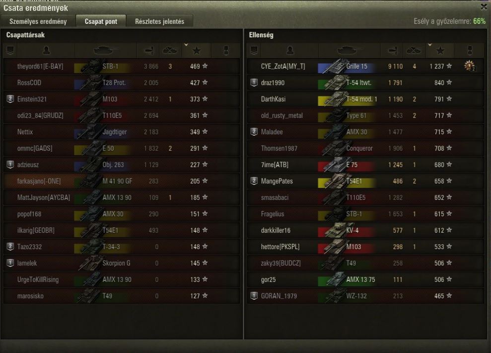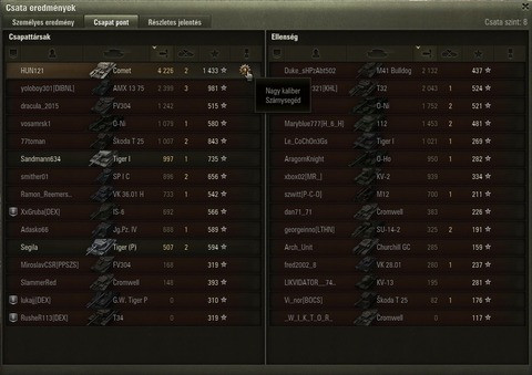 (#119980) Jolet: nekem annyi bajom van vele, hogy full kretén csapatokat kapok folyton, akiknek hiába a SPÚT, nem lőnek semmit, mert legtöbbször az induló kört sem hagyják el! Tegnap több ilyen csatám is volt. Illetve nálunk Vörös és Szürke 50 árnyalata, míg az ellenfélnél sötét zöld, kék és lila egyedek találhatóak! (tegnap pl egyik csatában volt az enemynél 3 olyan player, akiknek 30K felett volt a csataszámuk, egyik 68K és még így is 3K feletti majdnem 4 volt a WN8-uk!