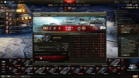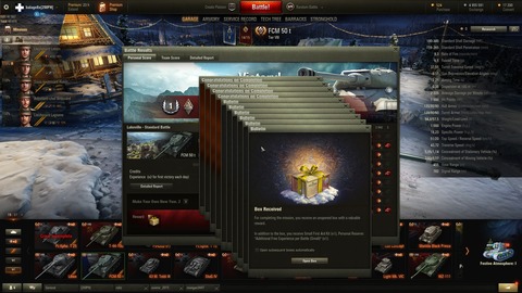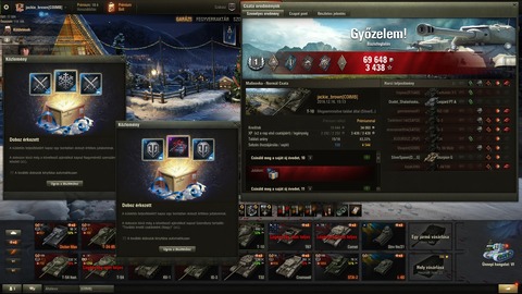 nehéz megmondani, mert én egy ideig csak gyűjtögető életmódot folytattam és még önmagamhoz képest is nagyon gyengén játszom, rossz RNG-vel, a tegnapi jó napom miatt ma ellenem súlyozott MM-vel. 16 csatát mentem, ebből 6 győztes. 1-2 alkalommal lőttem ki 4 tankot, 2-3 alkalommal 3-at. Csak 4 tankot dupláztam le, mert későn vettem észre, hogy az 1-es küldit minden tankkal lehet teljesíteni 1x, ami rengeteg I-es szintű díszt hozhat a sok XP mellé, ami a 8-ashoz kell, ahol viszont már 3-ast ad, igaz, csak egy dobozt.