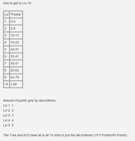 Emu: a díszeknek van 5 szintje, ki kell raknod a karifád+tankod minden szinten ezek: így léped a "holiday atm." szinteket, amiből 10 van. Van még pár homályos pont a díszek típusát, színét, cserélhetőségét illetően, valaki?