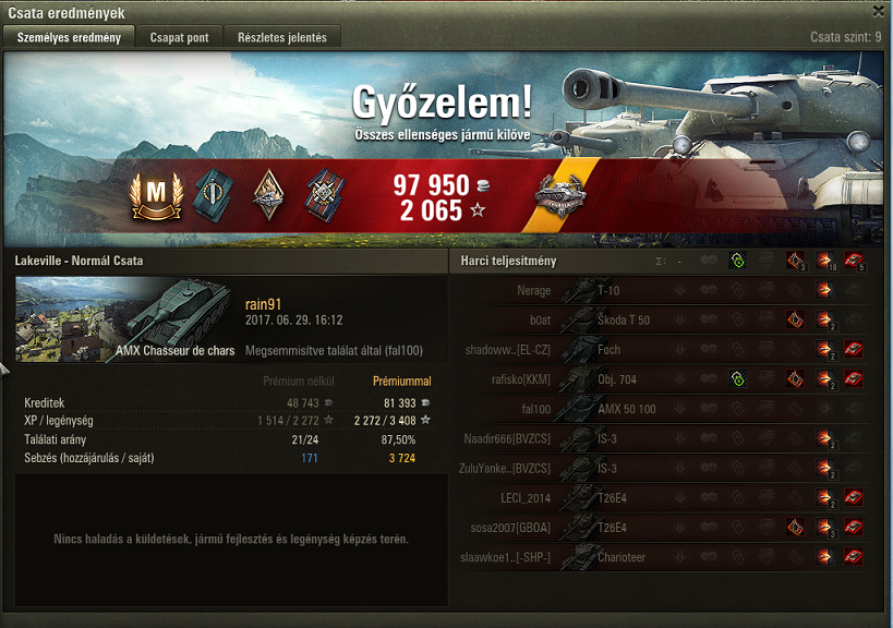 Legnagyobb gondom hogy nagyjából ilyen csatákkal tudok (értsd: magamhoz képest átlagon felüli) csak előrébb lépni a létrán miközben egy-egy csapattárstól kicsit többre számítottam volna az adott csatában.Különben ez az utolsó béta hét, aztán a folytatást talán még maga wg istene sem tudja.