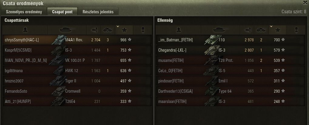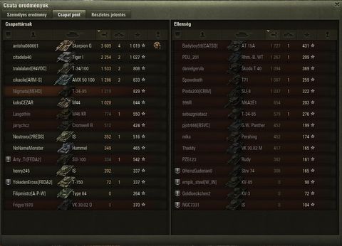 A pálya és tank választást inkább hagyjuk... Mindenki erőlteti orrba-szájba a heavyket, a nyílt pályákon is, hiába mondom hogy hozzanak gyors(abb) és jó látótávú tankokat, jönnek az IS-3-ak, T32-k meg egyebek, bezzeg az ellennek van esze és hoz svéd TD-t, Borsigot, egyebet... -