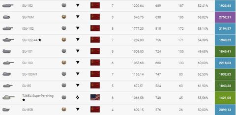 egyébként a jelenlegi statod azért annyi, amennyi, mert a BT-2 és T-46 tankok eredményei felhúzzák! Ha ezek nem lettek volna, akkor még ennél is gyengébb lenne.Te eredményeid SU tankjaiddal:
