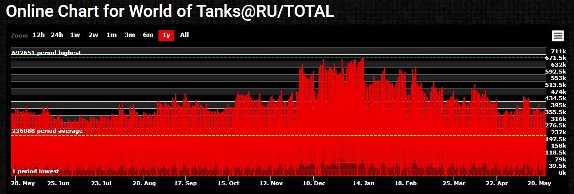 Amikor az eu szerveren lehúzzák a rolót akkor a ruszki szerveren még évekig menni fog a bolt. 10 szerver van ott. Van egy jó oldal amin meg lehet nézni a wot szerverek játékosszámának alakulását. Azt is mutatja melyik szerveren éppen hányan vannak online: stats.wotapi.ruAz elmúlt 1 év az eu és a ru szerveren: