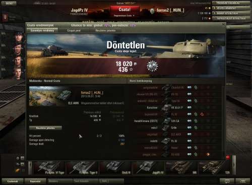 A Hellcat lövöldözött, meccs végén 3x több sebzést osztott ki... 2x több spot sebzése volt... 1,5x több tp-t kapott. De azért az E-25 magyar játékos jól megmondta, hogy nézze át mindenki a játék szabályokat mi hogyan működik! Ja, persze nyertük volna a csatát ha őkegyelme hajlandó lett volna lőni az ellenfeleit!