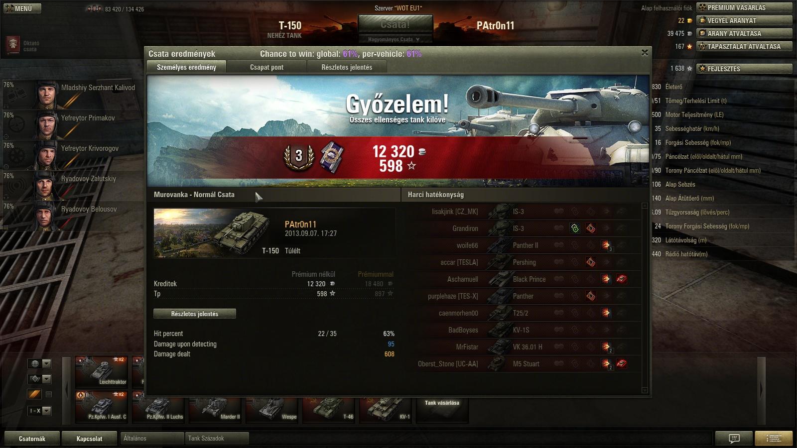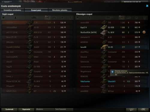Végre egy izgalmas meccs egy alap T-150-el. A végén 2db 8-as ellen voltunk 3-man bár már le voltak gyengítve. A végén én mentem spotolni az uccsó IS3-mat az arty-nak. Majdnem szét is lőtt, de előbb végzett az arty-nk vele.
