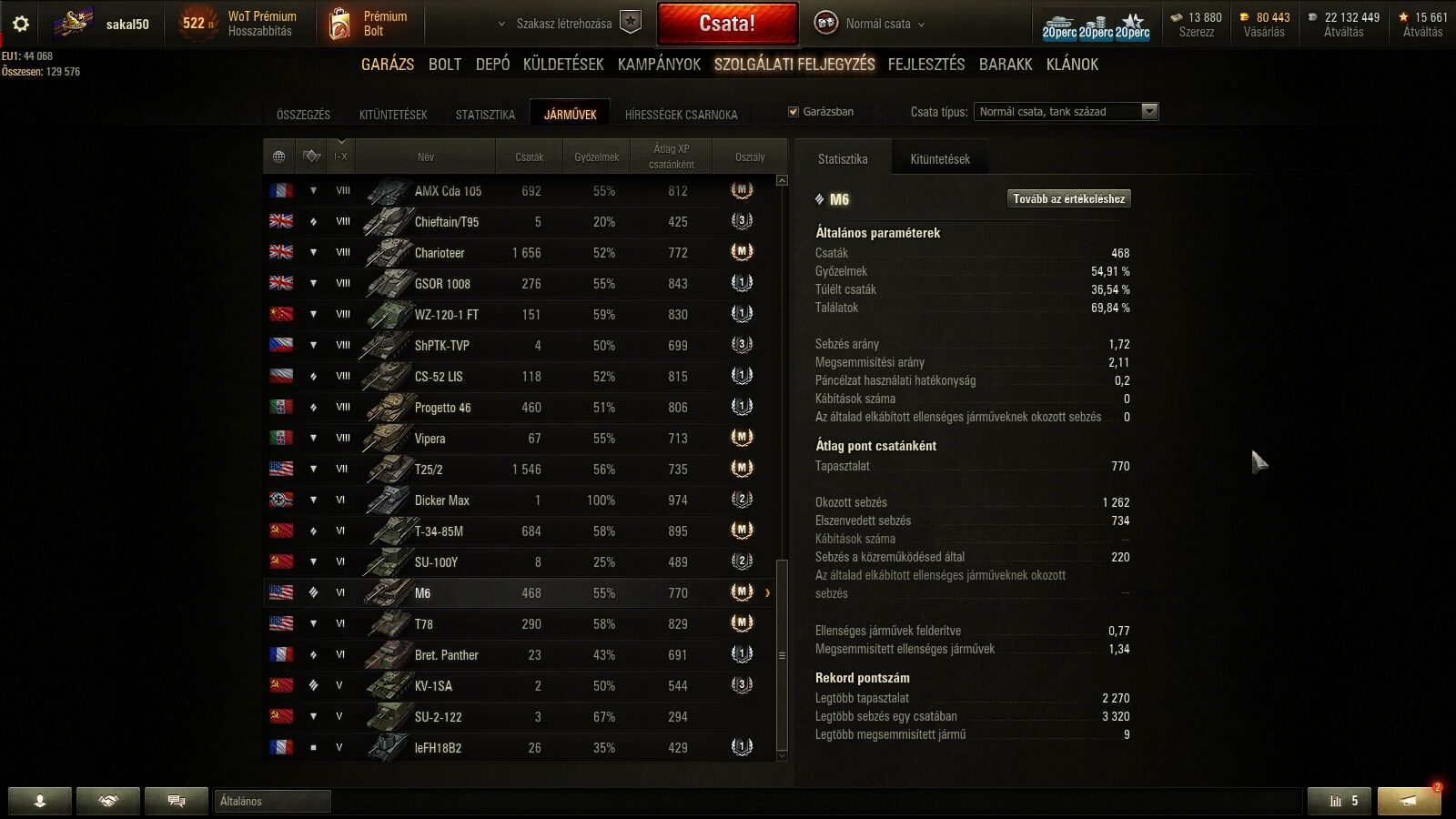 igaz nem egy mai darab, de a kv-1SA mag sem fogja kozeliteni ezt a szintet, és nem azért mert nem jo a játékos, hanem mert nem jo a tank. az M6-al még most is megyek kiemelkedoen jo koroket akár tier 8-ban is, megvan hozzá a jo ágyu: jo átutésu a gold, pontos, bár a sebzése lehetne egy kicsit tobb.